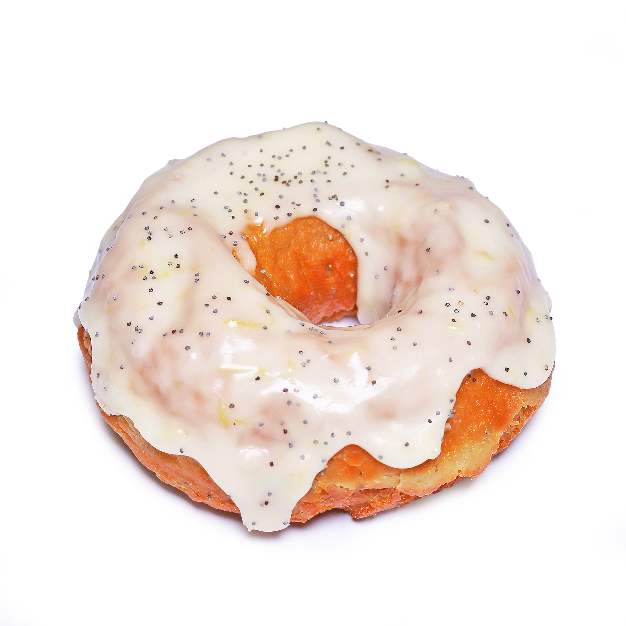Poppy seeds folded into a lemon zest dough. Dipped in a sweet lemon glaze and sprinkled with more poppy seeds.