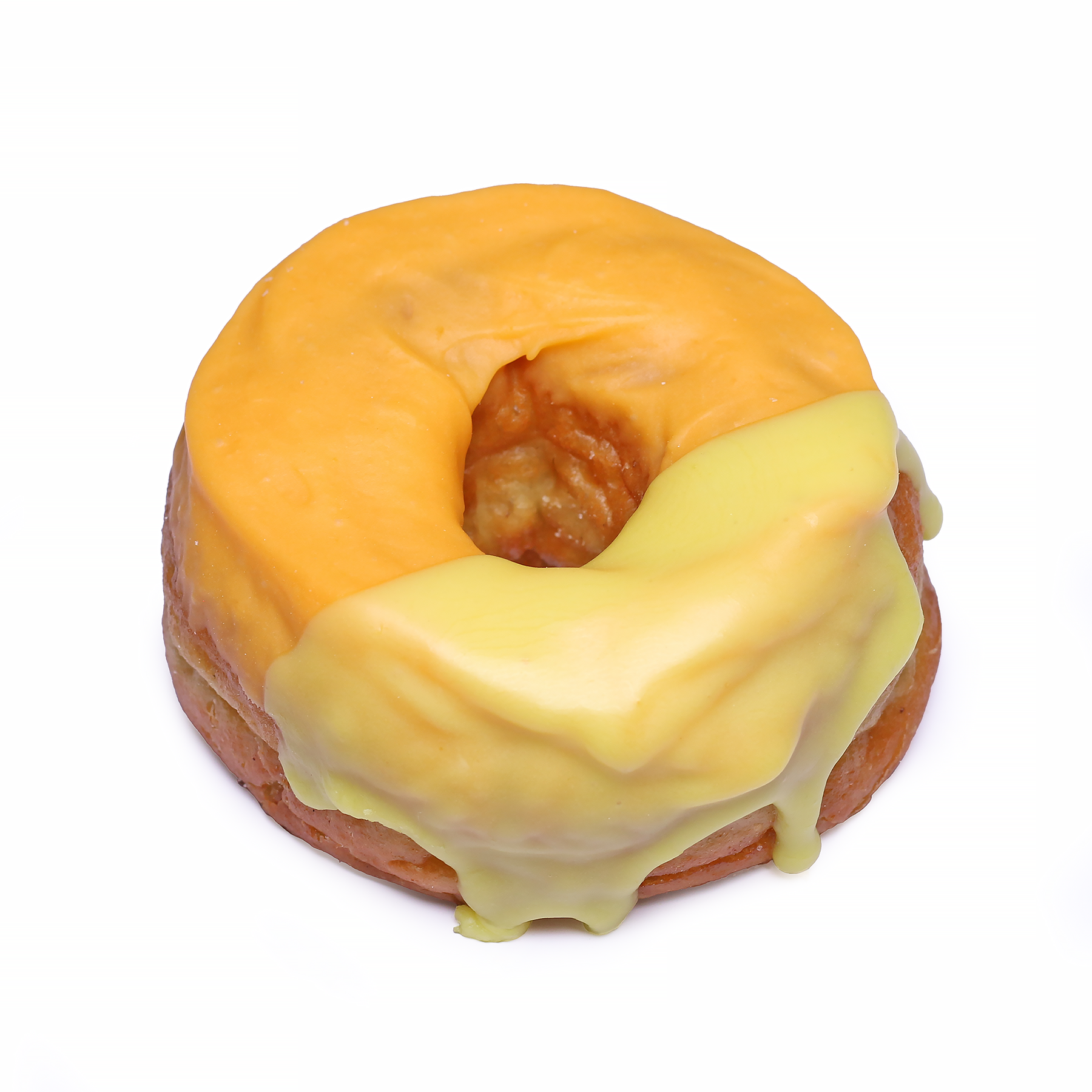 Vanilla and orange zest donut glazed with tangy passion fruit and milk chocolate.